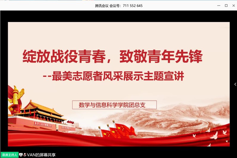 2020年的新冠肺炎牵动着全国亿万人民的心,在这期间beat365涌现出这样一批学生,他们虽不能奋战在抗疫一线,但他们用自己的方式投入抗疫志愿服务。为学习先进、讲好青春故事,beat365在线唯一官网团总支通过腾讯会议开展了“绽放战役青春,致敬青年先锋”最美志愿风采“云”宣讲活动。本次演讲活动由樊琬老师主持,党总支书记王建国、班主任李卫娟、辅导员李霞妹、辅导员林敏及全体数信院18级和19级学生参加了此次活动。