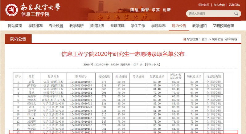519日,南昌航空大学信息工程学院公布了2020年硕士研究生统考招生拟录取名单,beat36516级教育技术学专业学生姚天拟被南昌航空大学信息工程学院电子信息专业录取。