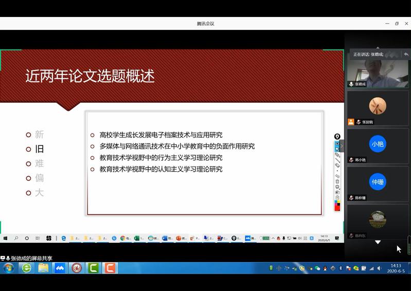 2020年6月5日下午,beat365在线唯一官网邀请盐城师范学院张德成副教授给教育技术学专业师生开展“教育技术的毕业论文选题遴选”专题讲座。讲座由学院教学副院长张居晓副教授主持,2017级教育技术学专业毕业论文指导老师及学生代表聆听了讲座。