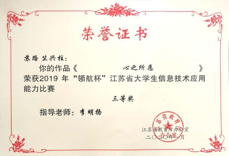 在2019年“领航杯”江苏省信息技术应用能力大赛中,beat365李明扬老师指导的多组同学参加了该项比赛。其中苏路、竺兴柱同学报名参赛的视频作品《心之所愿》荣获三等奖。“领航杯” 江苏省信息技术应用能力大赛是由江苏省教育厅举办的省级赛事,面向全日制在校大学生,参赛作品形式包括微电影、教学微视频、动画作品、网站作品、APP作品、课件作品、软件开发作品等等,该项赛事每年举办一次。(文、图/李明扬)