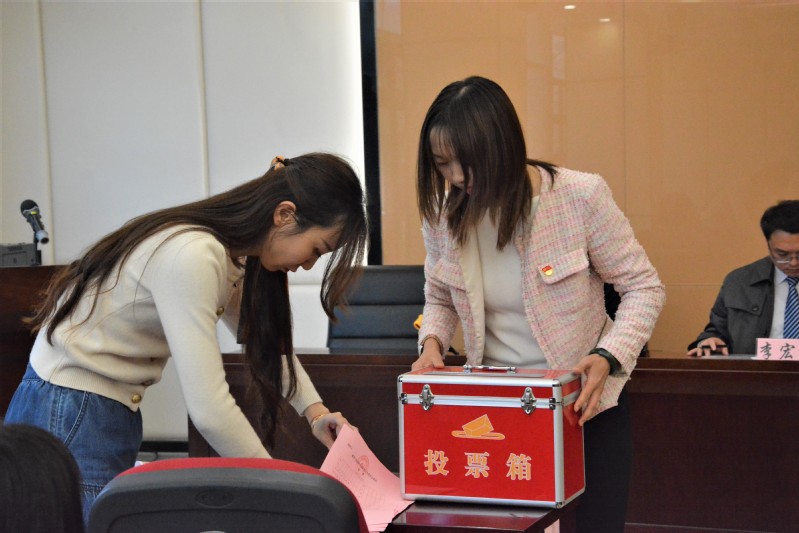 随后,大会表决通过了《选举办法》《监票人、计票人名单》,学院党总支书记李宏伟宣读了校党委《关于二级党组织委员会委员和书记(副书记)候选人预备人选请示的批复》,工作人员介绍了学院党总支委员候选人基本情况。大会通过无记名投票的方式差额选举出了李宏伟、李霞妹、张居晓、胡作进、凌小艳5名同志组成党总支新一届委员会。