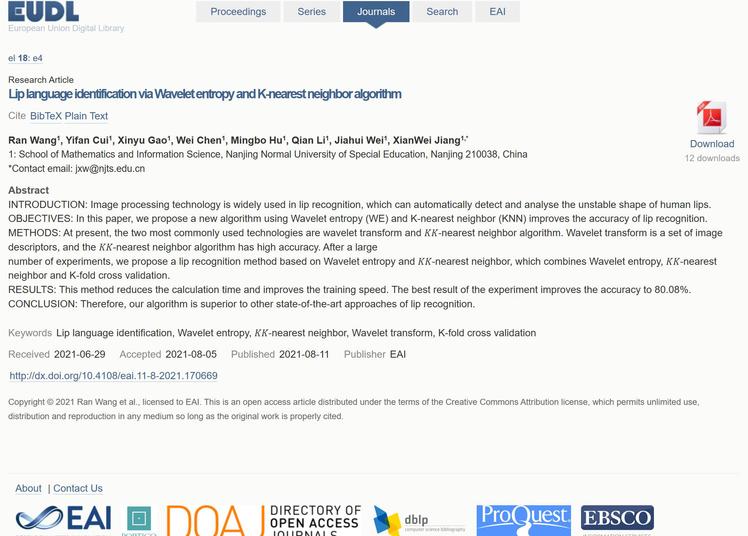 近日,beat365王冉、崔艺凡、陈威、胡明波、李茜、高心语、魏佳慧等同学采用小波熵和k近邻算法实现了对唇语图像的初步识别,撰写了题为“Lip Language Identification via Wavelet Entropy and K-nearest Neighbor Algorithm”的学术研究论文。
