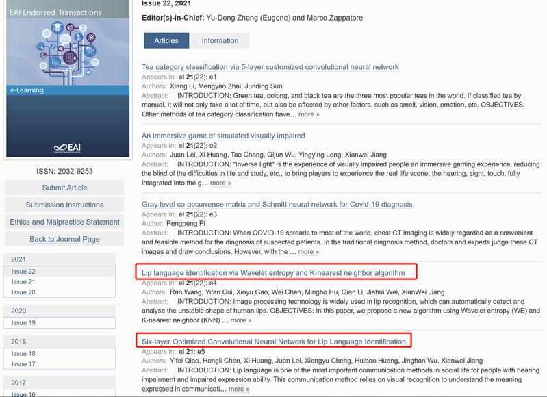 乔懿飞、陈泓利、成翔宇、黄惠宝、黄袭、雷娟、吴靖涵等同学则采用优化的卷积神经网络模型实现了对唇语图像的识别,并撰写研究论文“Six-layer Optimized Convolutional Neural Network for Lip Language Identification”。