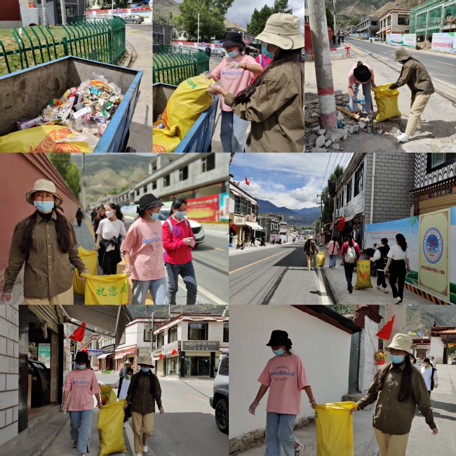 随后的几天,团队分别前往拉萨北郊山和西郊街道进行社会实践。前者地处偏远、人烟稀少,导致长期无人清理,垃圾堆积严重;后者人流量大、很多人随手扔的垃圾被风吹得散落到墙角、草丛等隐蔽角落。团队成员们分工合作、干劲十足,三三两两或行走在山区的羊肠小道上,边走边将路边草坪上的白色垃圾收集在黑色的环保垃圾袋中;或穿梭在热闹的街道上,默默地成为散落各地的垃圾和墙上的小广告清理干净,形成了美丽拉萨的一道靓丽的风景线。