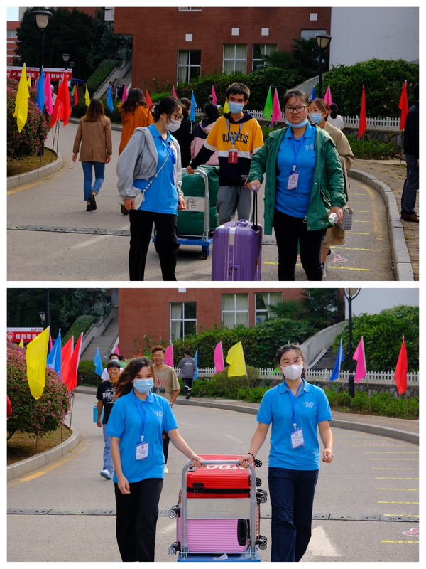 学生党员志愿者用小推车把新生的行李送往宿舍。在送往宿舍的路上,向新生介绍着学院发展历史和文化底蕴,解答学习、生活、职业规划等各方面疑惑。学生党员和新生接触的时间虽短,但热情周到的服务却让新生们感受到学校的关怀、学院的关爱、学长的关心。