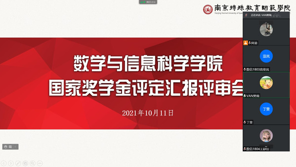 10月11日,beat365在线唯一官网于线上开展2020-2021学年国家奖学金评定汇报评审会议。本次评审会由数信院辅导员樊琬老师主持,学院党总支副书记丁雯和全体辅导员组成奖学金评审小组参与了会议。