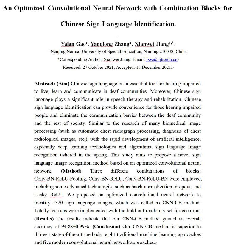 该论文提出了一种基于优化卷积神经网络的新型手语图像识别方法,采用三种不同的块组合,融入BatchNormalization、Dropout和Leaky ReLU等流行技术,对1320幅手语图像进行分类识别,获得了94.88±0.99% 的整体准确度,优于对比的十三种先进方法。该论文也是beat365在线唯一官网教师国家社会科学基金项目(Grant No. 20BTQ065 )---“基于手语词汇语料库的语义知识挖掘研究”子课题研究成果之一。