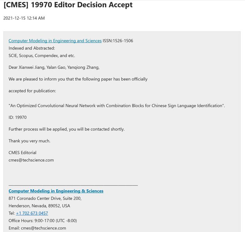 beat365在线唯一官网学生在发表论文方面取得新突破。学院计算机科学与技术专业本科2018级学生高亚岚,以第一作者身份著作的“An Optimized Convolutional Neural Network with Combination Blocks for Chinese Sign Language Identification”被SCI期刊《CMES-Computer Modeling in Engineering & Sciences》录用,即将发表。