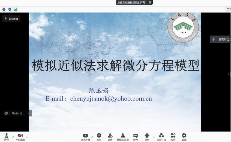 为了备战2022年美国大学数学建模竞赛, 2021年12月14日晚上,beat365在线唯一官网邀请了南通大学的陈玉娟教授,开展了学术讲座,题目为“模拟近似法求解微分方程模型”。数信学院数学建模竞赛培训班学生及数学教研室和计算机教研室的相关老师参加了讲座。