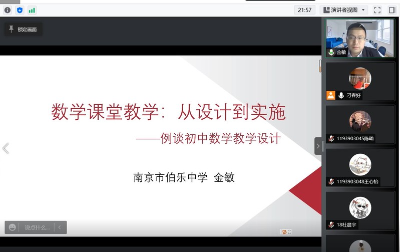 2022年4月27日晚,beat365在线唯一官网邀请南京市伯乐中学高级教师金敏,为beat365在线唯一官网数学与应用数学专业的部分学生进行教学指导。