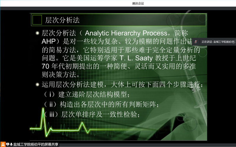 在这次讲座中,杨教授介绍了数模美赛的发展历史,并用生动的案例讲解了参赛注意事项,以“综合评价技术在数学建模中的应用”为主题详细介绍了多指标综合评价技术、综合评价的五个要素、数据规范化处理、综合评价模型以及综合评价技术实施步骤,并以长江水质综合评价问题为例介绍了层次分析模型在数学建模中的具体应用。