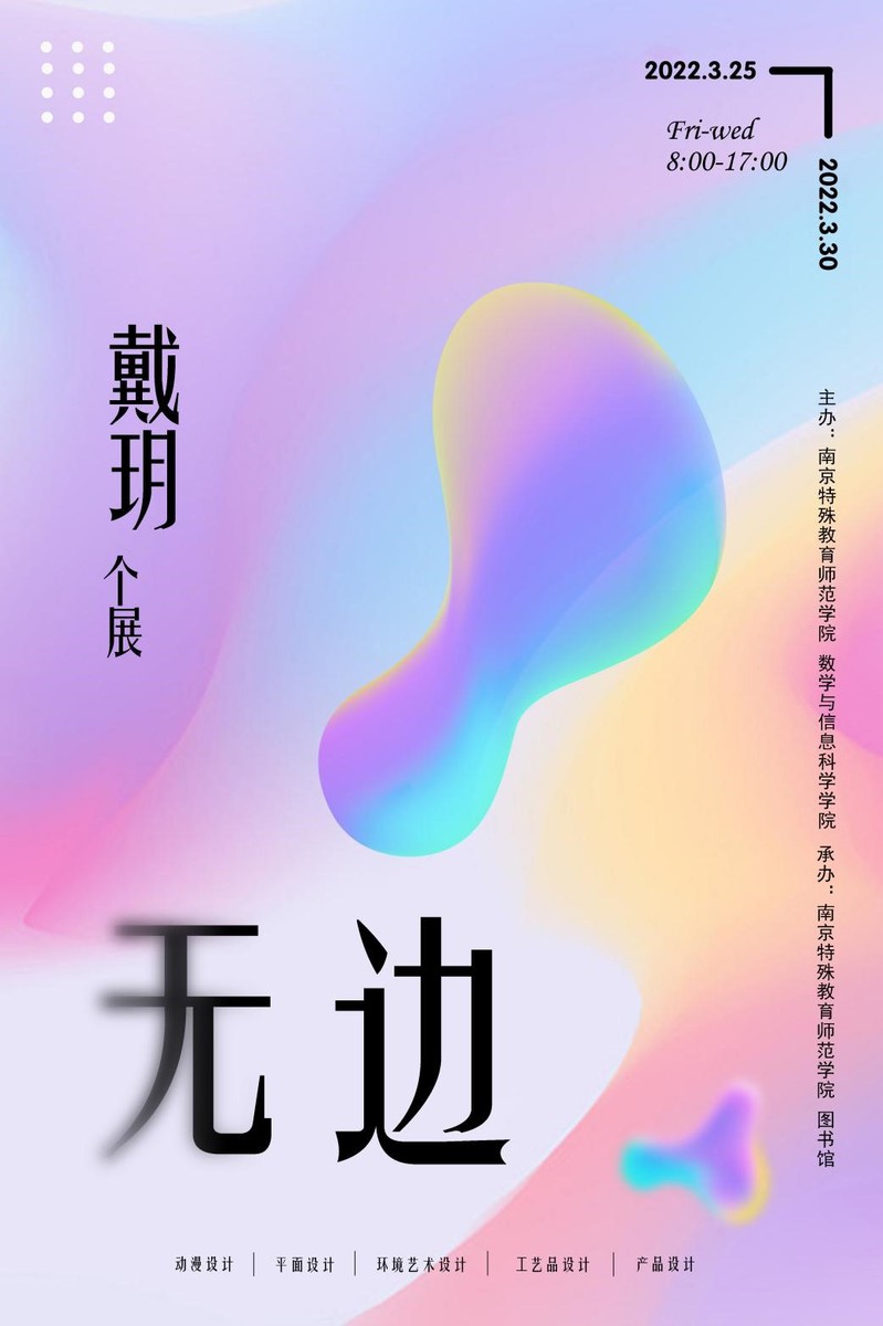 3月25日,beat365在线唯一官网戴玥老师的个人艺术作品展在图书馆二楼展厅举办。本次展览主题为“无边”,共展出了戴玥近几年创作的40余幅设计作品,作品题材广泛、形式多样,涵盖了动漫设计、平面设计、UI设计、产品设计、环境艺术设计、工艺品设计等。