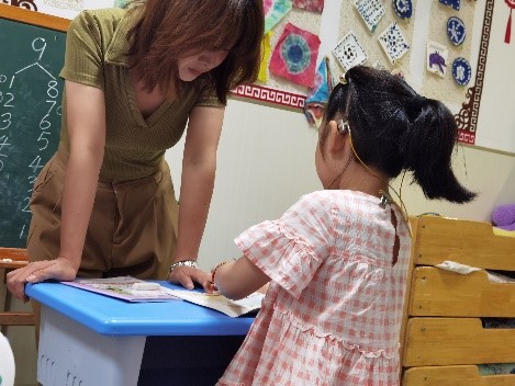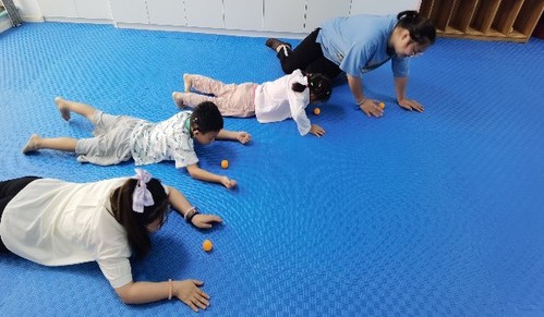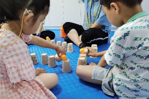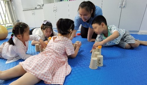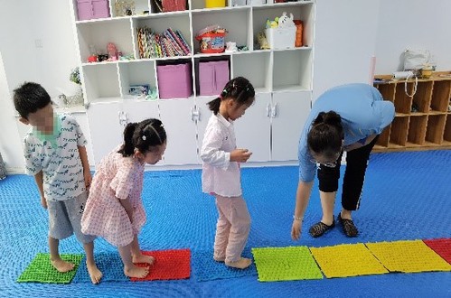 在经过老师介绍以及参观后,朱老师的安排实践团成员分别进入不同的教室进行听课学习,在不打扰老师授课的前提下,与特殊儿童进行比较亲密的接触学习。其中有一堂课老师给孩子们上8和9的加减,个别化的给每个孩子提前定下了的不同的教授方法和学习目标,并且检验学习结果的方式也是不一样。最特别的是感统训练课程,在团队成员陪同孩子们完成各个小游戏的同时,孩子们在娱乐中就能锻炼到特殊儿童的平衡感,手眼协调能力,较好的粗大动作和精细动作控制能力等等。