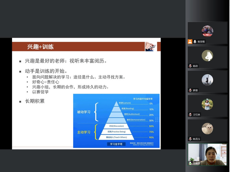 王丽英教授指出提升学生编程水平可以结合兴趣+训练的方式,通过成果激发,任务驱动,建立同伴团队,长期积累,教师要合理安排讲练比例,选择合适的教材和优秀的参考书,建设好微课、慕课,提出了培养信息时代学习者的能力要求。王教授还结合教育学、心里学强调发挥学生内部动机和效能,特别提出了基于认知策略、元认知策略和情感策略的思想方法,指出各种语言的学习是有直接联系的,教师要帮助学生实现两者之间的切换和补充。