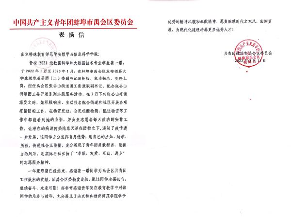 学雷锋纪念日前夕,学院收到来自共青团蚌埠市禹会区委员会对数据科学与大数据技术专业2106班学生姜一诺的感谢信。