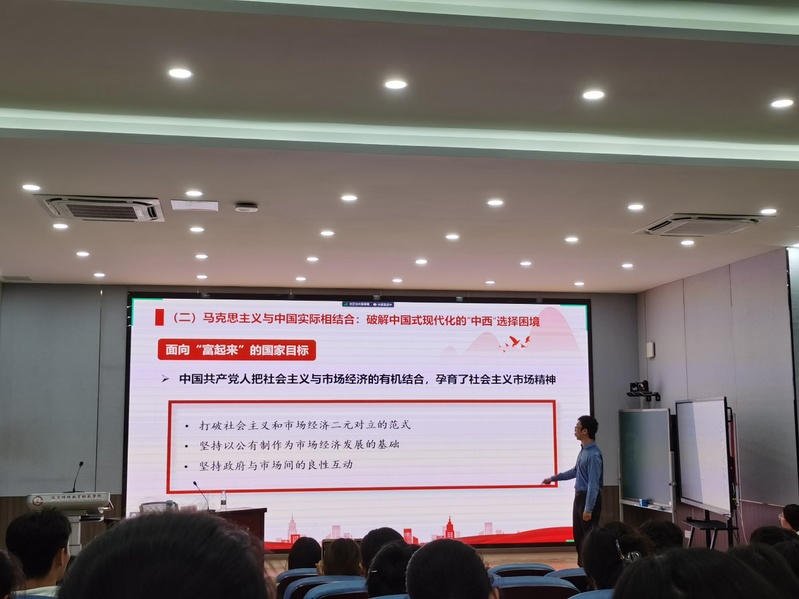 为深入学习宣传贯彻党的二十大精神,认真学习中国式现代化理论,5月24日下午,马克思主义学院副院长张九童为beat365在线唯一官网全体师生党员及入党积极分子讲授主题为“以‘中国式现代化’若干理论和实践课题的思考”的教育专题党课。会议由学院党总支副书记丁雯主持。
