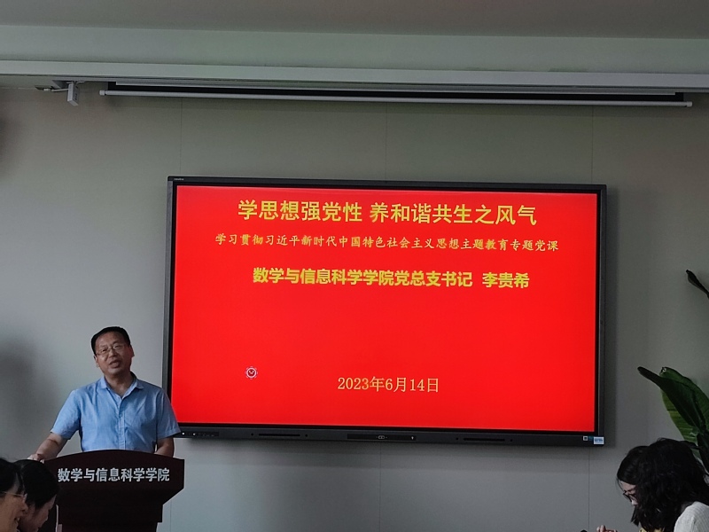 6月14日下午,在博雅楼3601会议室,党总支书记李贵希以《学思想强党性,养和谐共生之风气》为题,讲授学习贯彻习近平新时代中国特色社会主义思想主题教育专题党课。beat365在线唯一官网全体师生党员,集中聆听了党课。党课由学院党总支副书记丁雯主持。