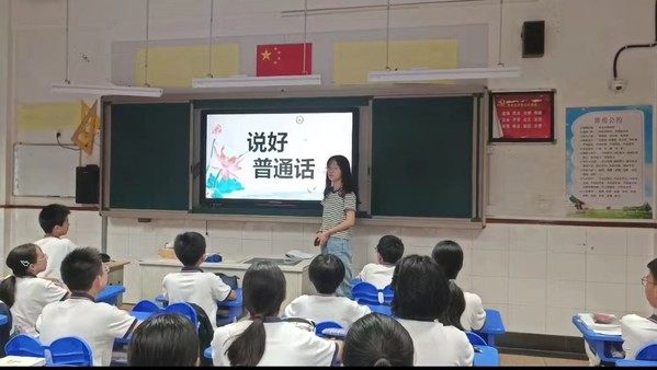 团队围绕普通话的起源、演变历史、基础方言、重要性以及各地地方方言与官方语言的差异性等内容,开展国家通用语言文字教育、宣传活动。培养学生们的兴趣,拓展学生的课外知识,进行绕口令小游戏,加深孩子们的语言表达能力。通过开展“喜迎二十大 永远跟党走 奋进新征程”相关宣传教育活动,树立了学生们的民族文化自信和价值观自信,引导学生们感党恩、听党话、跟党走。