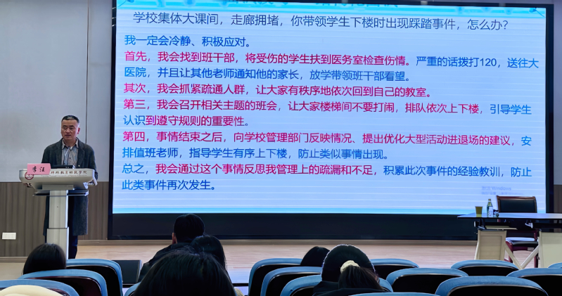 学院教学科研科长杜文老师在总结中谈了他听讲座的体会,希望同学们认真学习李校长精彩报告的精神、汲取丰富的营养,并结合学科特点对各专业学习给出了针对性建议,鼓励师范生高效科学学习。通过讲座的专业指导和经验分享,切实加强了师范学子对教师基本功、教师资格证面试基本环节和备考技巧等方面的深入了解,有效缓解了同学们的考试焦虑,营造了良好的提升师范技能的学习氛围,助推学生成长成才。(文/朱恬仪 图/高艺桐 蔡欣颖 编辑/杜文 审核/王兵)