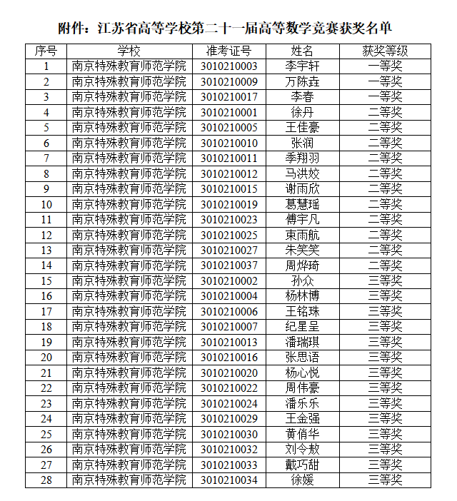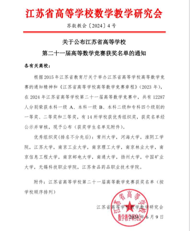 近日,江苏省高等学校第二十一届高等数学竞赛在全省各大高校隆重举行。beat365beat365在线唯一官网数学系老师们辛勤付出、精心指导,带领学生们勇攀高峰,最终斩获了3个一等奖、11个二等奖和14个三等奖的辉煌成绩,创下了beat365近五年来在该竞赛中的最佳纪录。