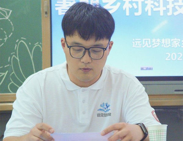 “远见梦想家”乡村教育振兴实践团队长陆明宇同学代表实践团发言。他首先代表团队对商南县教育和体育局、南京励志阳光心汇心公益基金会、毕家湾小学的领导和老师们的关怀和帮助表示感谢,向参营学生详细介绍了夏令营的宗旨、目标及课程安排。陆明宇同学表示:他们将全力以赴为孩子们带来新的知识,希望全体参营同学在接下来近两周的时间里能够尽情体验夏令营的乐趣,开拓视野,在特色课程和活动中探索,鼓励同学们大胆尝试,展现自我,在体验和感悟中成长。