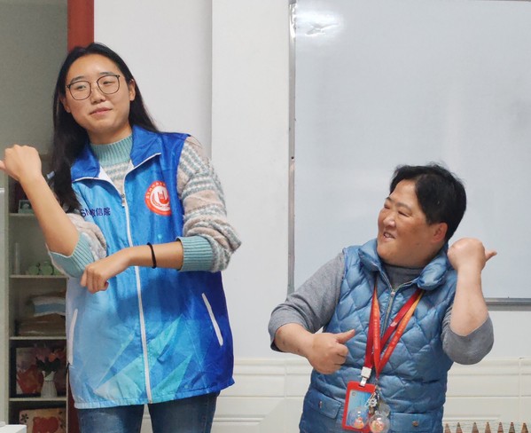 最后,志愿者们带领残疾人朋友做手指操,志愿者们耐心地指导,对手指操进行分步分解,使残疾人朋友能够更容易地接受和学习。残疾朋友们慢慢的学会了手指操,灵活性和反应能力得到锻炼。他们勇敢的走上舞台,与志愿者们一起展示学习成果。