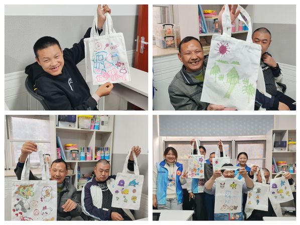 随后,志愿者们引导残疾人朋友在帆布袋上绘制自己喜欢的花型图案。在绘画过程中,残疾朋友们积极地挥舞着画笔,用不同的颜色绘制出精美的图案,这些表现出他们美好的内心世界,志愿者们也耐心地讲解和示范,帮助残疾人朋友锻炼想象力和创新能力。